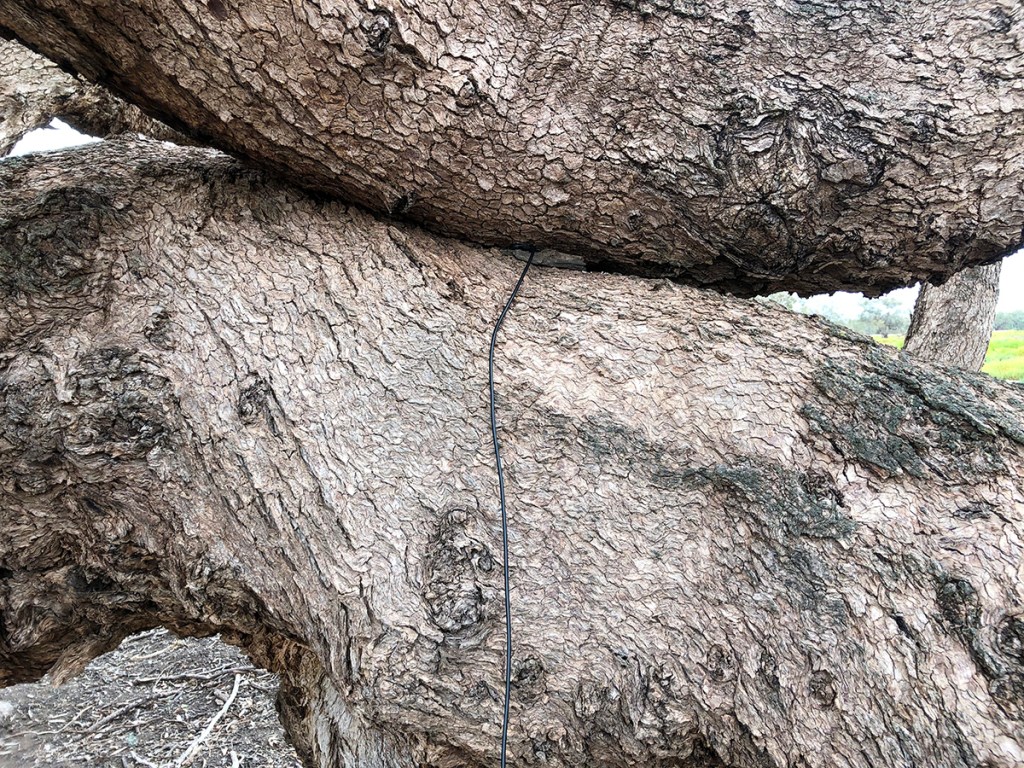 Eucalyptus coolabah is a straggly tree always with some rough bark over part or all of the trunk but with the upper trunk and branches are smooth. Adult leaves are dull green to greyish green. Small ovoid buds are borne in profusion in branched clusters at the ends of branchlets in late spring/early summer and are often glaucous.