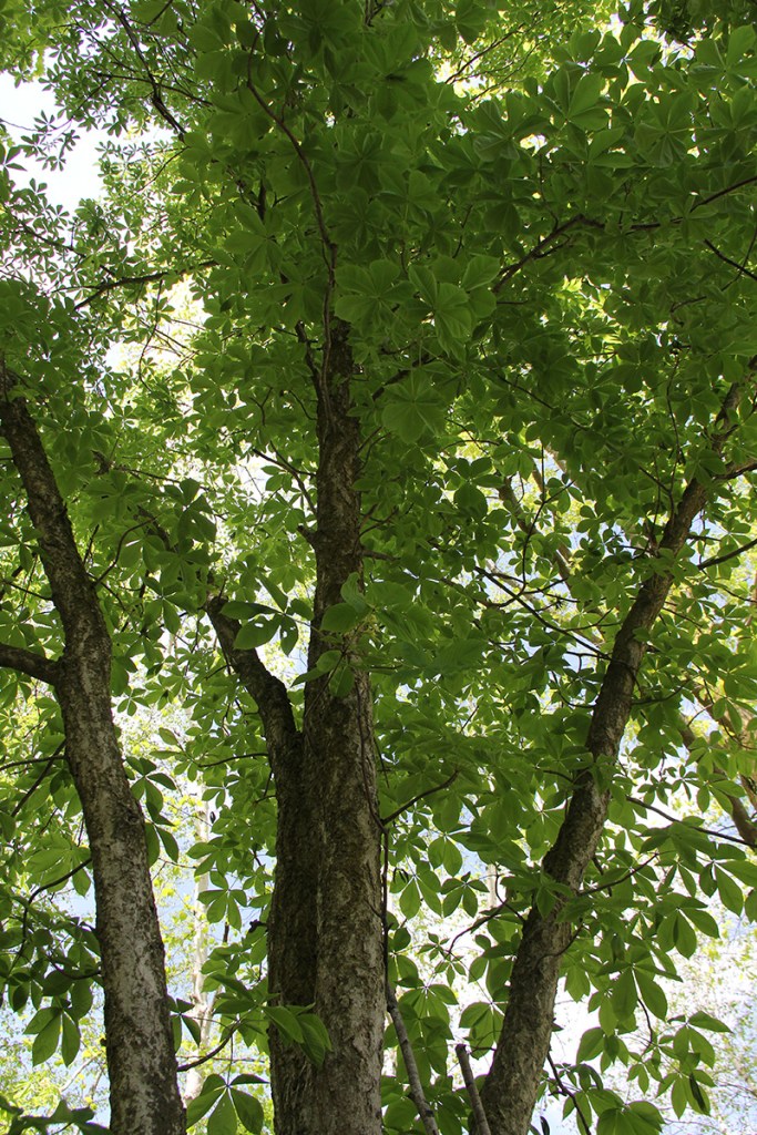 This particular Ohio Buckeye is part of the Rare Woody Plants of Ontario collection at the Arboretum, University of Guelph.There are eleven Ohio Buckeyes in the collection. The species holds an S1 designation in the the province: Extremely rare in Ontario (usually 5 or fewer occurrences in the province, or very few remaining remaining hectares). The Ohio Buckeye is a medium-sized canopy tree that typically reaches a height of 50–75 feet. Often used as an ornamental tree, it is known for its interesting fruit and vibrant orange foliage in the fall. Its branches curve downward towards the ground before arching back upward, forming a rounded silhouette. The tree’s dense, attractive, deciduous foliage is palmately compound. It produces showy, upright clusters of blossoms at the tips of its twigs. The fruit is encased in a spiny, splitting husk (capsule). When crushed, the tree’s twigs and leaves may release a slightly unpleasant odour.