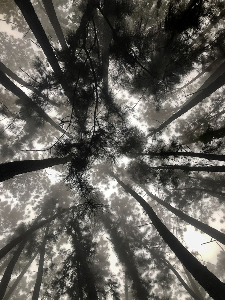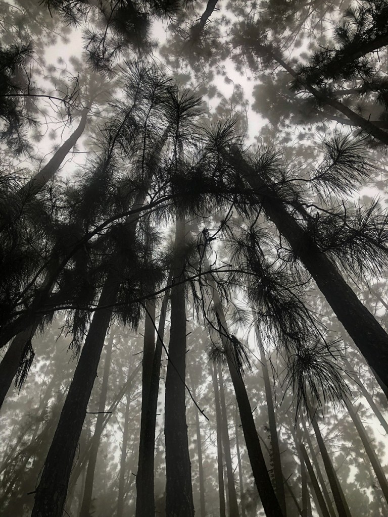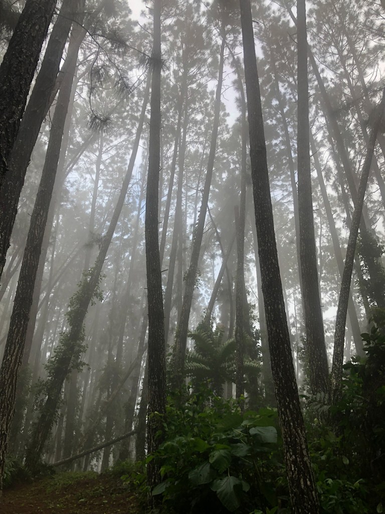This is a reforested plantation of Caribbean Pine (Pinus caribaea), established over 40 years ago. This species is native to Central America and the Caribbean, and the trees in this forest reach heights of 20-30 meters. It is characterized by its long green needles, thick bark, and woody cones.
