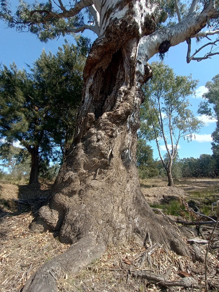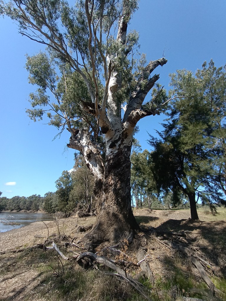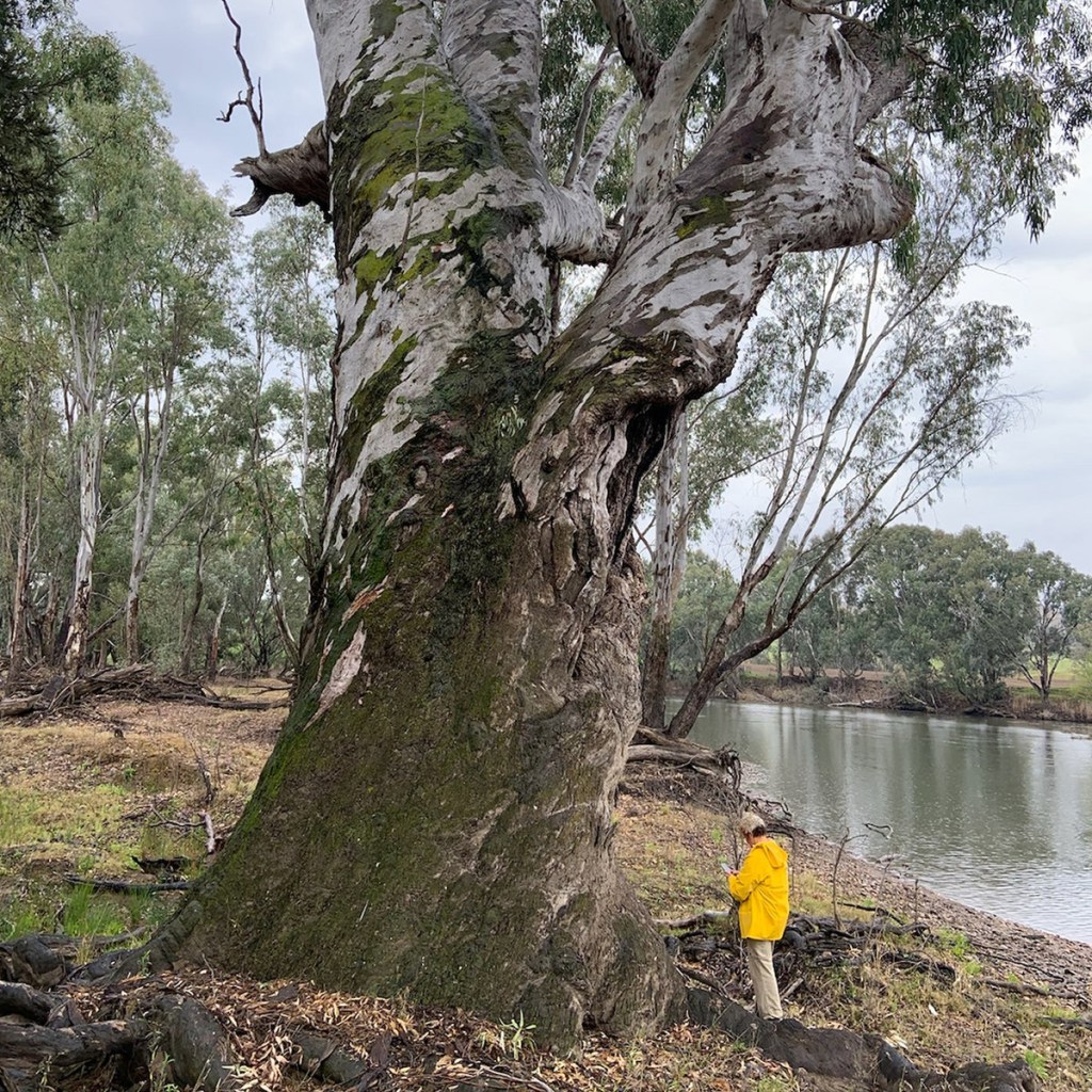 Eucalyptus camaldulensis, commonly known as the River Red Gum, is a significant tree species that typically attains a height of 20 metres, though it can sometimes reach up to 45 metres. The tree is identified by its smooth bark, which is generally white or cream-coloured and often features patches of yellow, pink, or brown. Near the base of the trunk, there are frequently loose, rough slabs of bark. The foliage of the River Red Gum progresses from small lance-shaped juvenile leaves to larger lance shaped adult leaves coloured a dull grey green. The flower buds are arranged in groups of seven, nine, or occasionally eleven. Flowering primarily occurs in summer, producing white flowers, and the plant’s flowers bloom for a long time throughout the year. It is a culturally important tree for indigenous peoples with many parts of the tree used including the wood, bark, leaves and sap. Canoes were made from the outer bark layer and shields from the harder wood just under the bark.