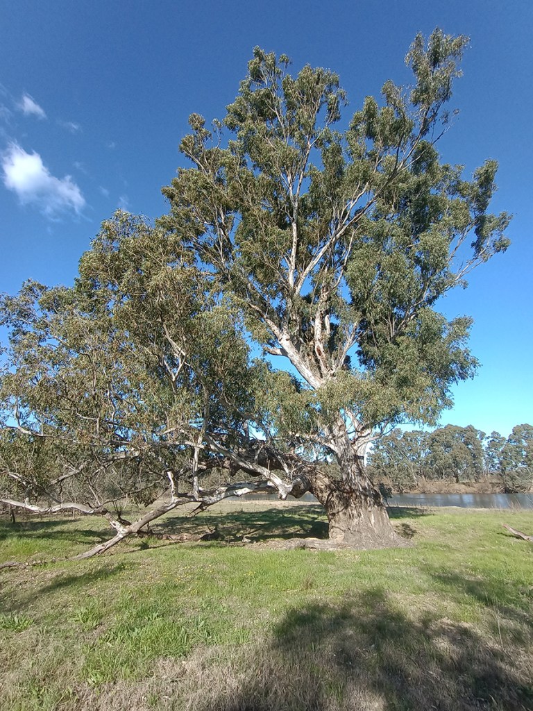 Eucalyptus camaldulensis, commonly known as the River Red Gum, is a significant tree species that typically attains a height of 20 metres, though it can sometimes reach up to 45 metres. The tree is identified by its smooth bark, which is generally white or cream-coloured and often features patches of yellow, pink, or brown. Near the base of the trunk, there are frequently loose, rough slabs of bark. The foliage of the River Red Gum progresses from small lance-shaped juvenile leaves to larger lance shaped adult leaves coloured a dull grey green. The flower buds are arranged in groups of seven, nine, or occasionally eleven. Flowering primarily occurs in summer, producing white flowers, and the plant’s flowers bloom for a long time throughout the year. It is a culturally important tree for indigenous peoples with many parts of the tree used including the wood, bark, leaves and sap. Canoes were made from the outer bark layer and shields from the harder wood just under the bark.