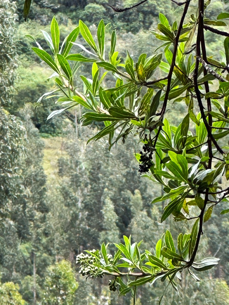 The Escallonia resinosa (Chachacomo) tree is a hardy, high-altitude Andean evergreen tree native to Peru, Bolivia and Ecuador. It grows up to 20 feet, although this particular tree was taller. The trunk has an irregular shape and is often twisted, with a reddish papery bark. The leaves are spirally arranged and clustered at the end of branches. Flowers are small and white and bloom July-September. This specimen was covered in moss and not flowering.